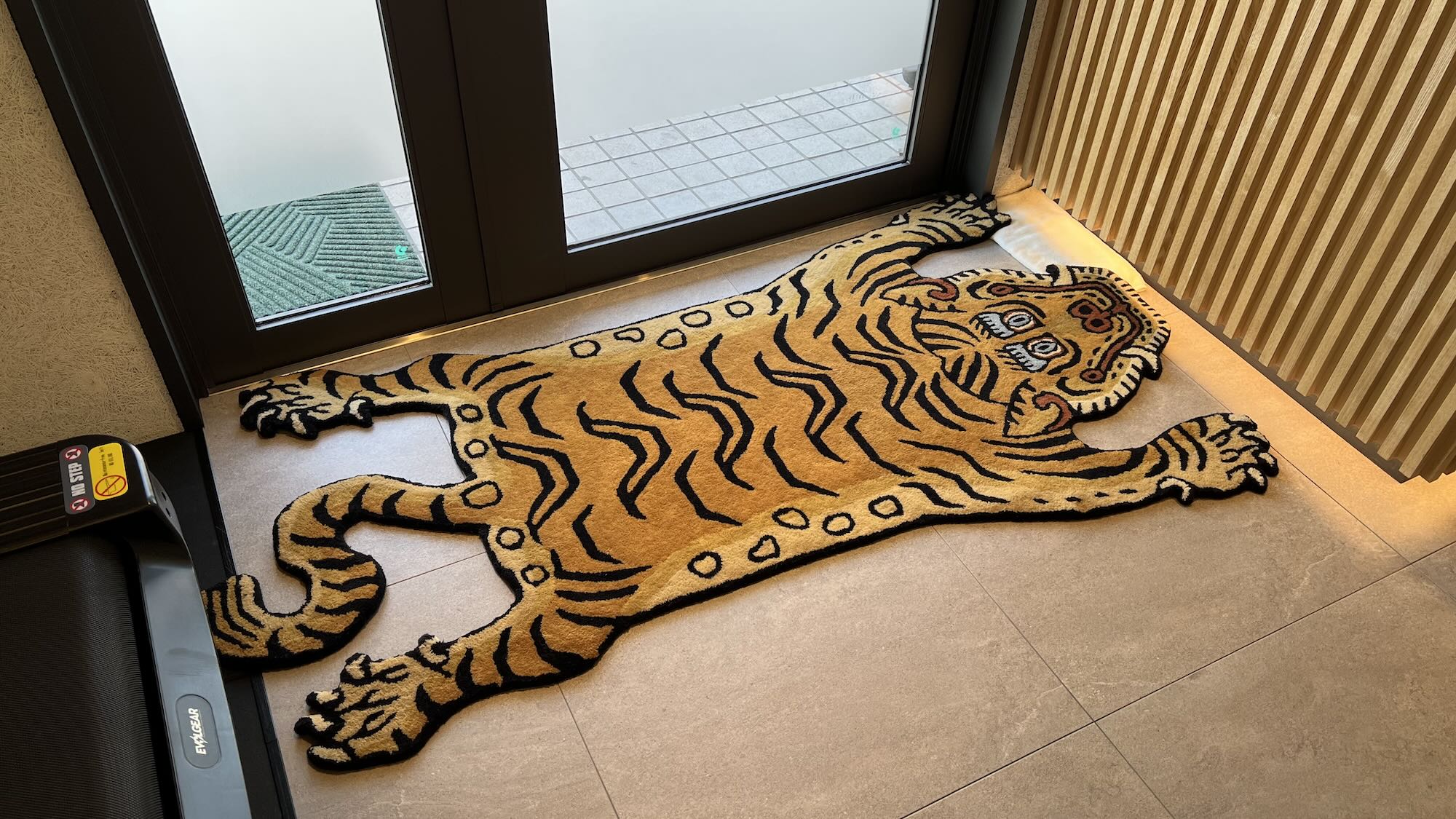 玄関マットをクリーニングに出したら、特殊マットだったみたいで、3週間以上かかるということで、一時的にトラを置くことになりました。