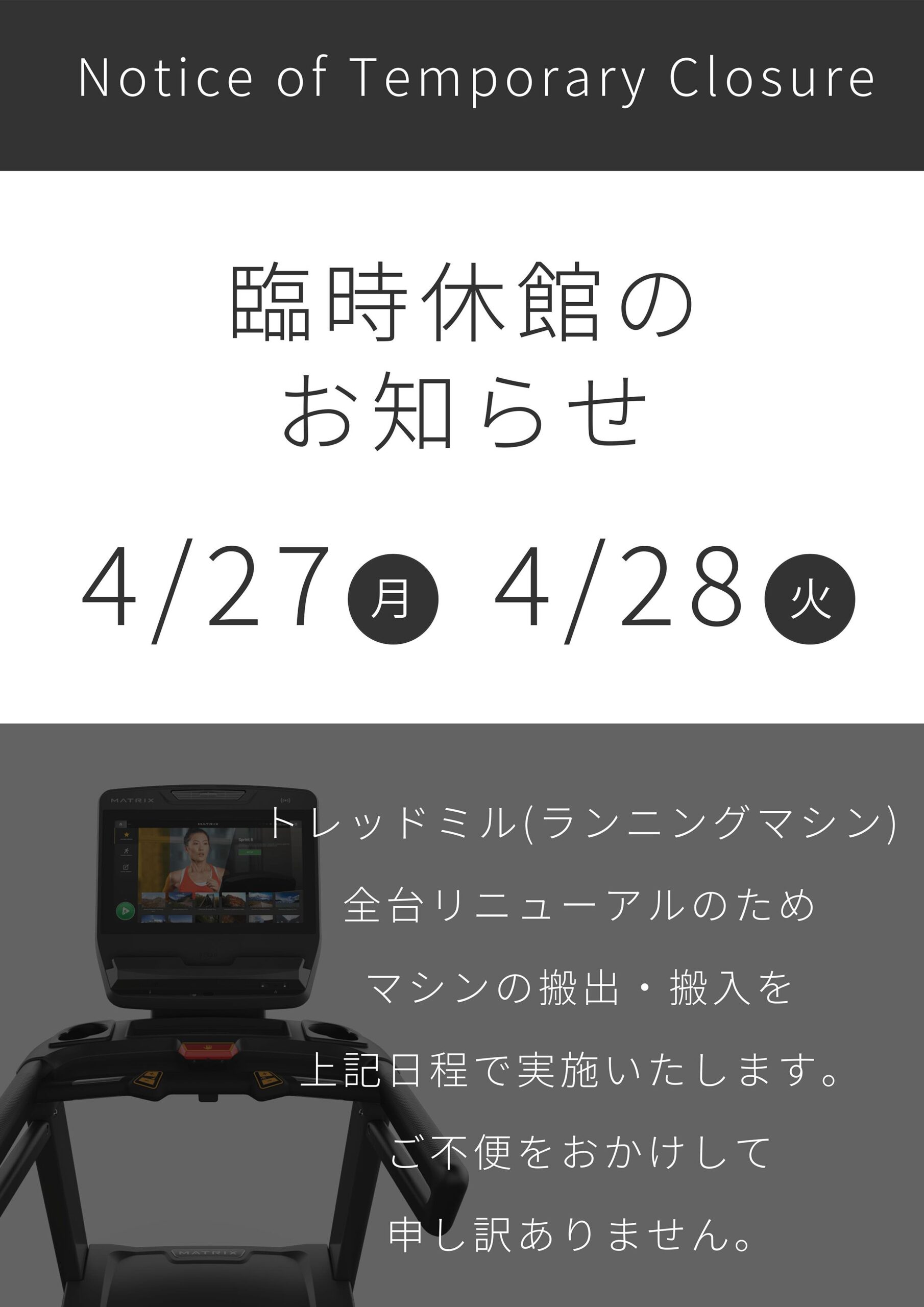 どうも、太宰府市西鉄五条駅徒歩1分にある24時間ジム「MINI GYM 365」のオーナー荒木です。トレッドミル(ランニングマシン)リニューアルに伴い、4月27日(月)・4月28日(火)はマシンの入れ替えのため臨時休館とさせていただきます。ご不便をおかけいたしますが、ご理解とご協力のほどよろしくお願いいたします。